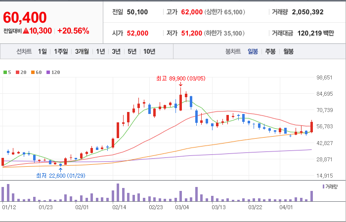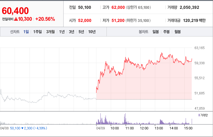현재가: 60,400, 어제대비:+10,300시총: 6,919억원, 거래량:2,050,392, 거래대금:120,219백만