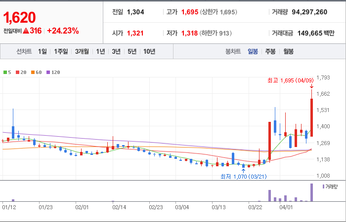 현재가: 1,620, 어제대비:+316시총: 910억원, 거래량:94,297,260, 거래대금:149,665백만