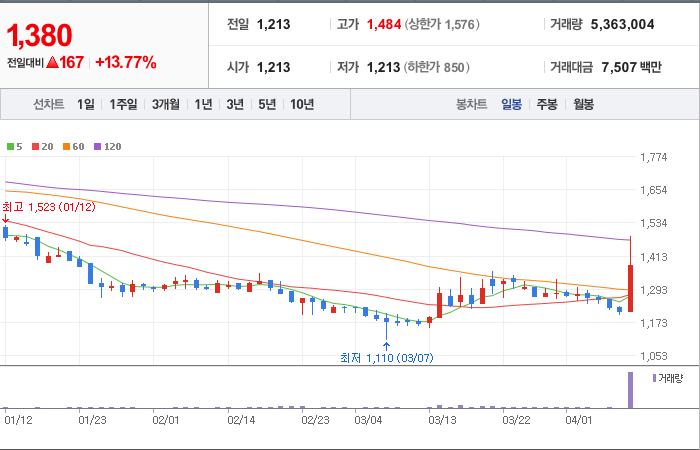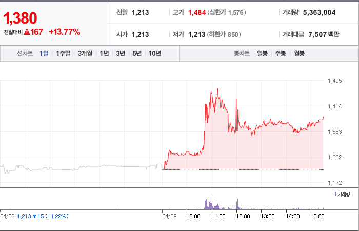 현재가: 1,380, 어제대비:+167시총: 746억원, 거래량:5,363,004, 거래대금:7,507백만