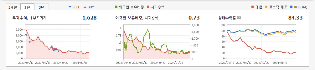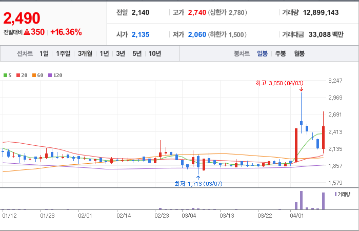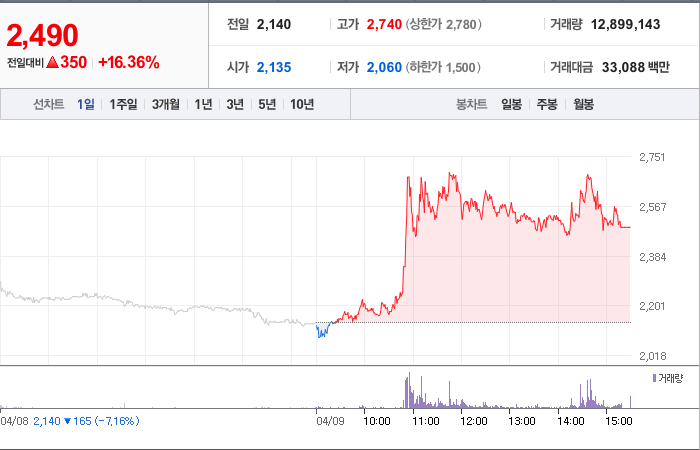 현재가: 2,490, 어제대비:+350시총: 1,393억원, 거래량:12,899,143, 거래대금:33,088백만