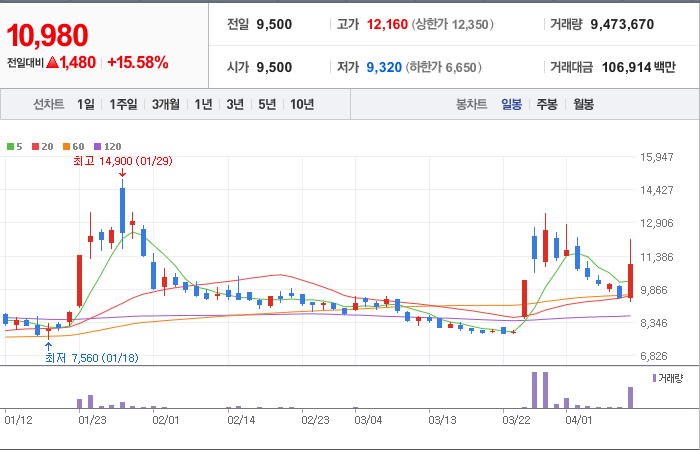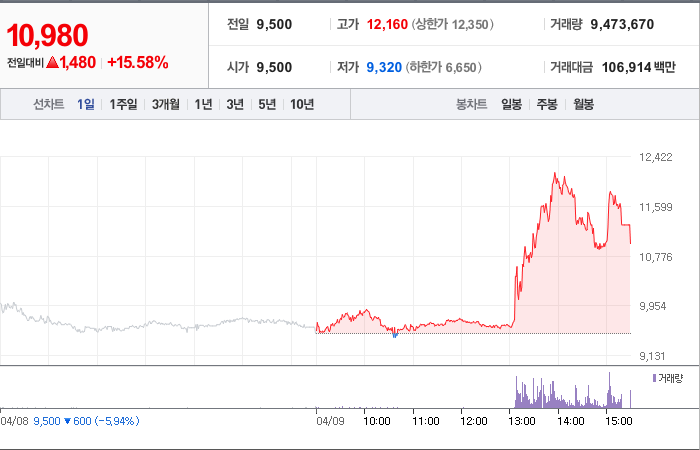현재가: 10,980, 어제대비:+1,480시총: 1,657억원, 거래량:9,473,670, 거래대금:106,914백만