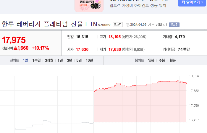 10. 한투 레버리지 플래티넘 선물 ETN 등락률: +10.17%