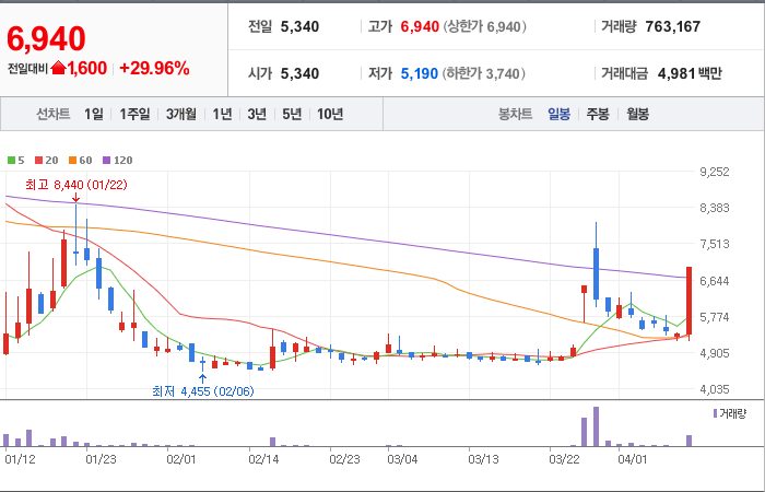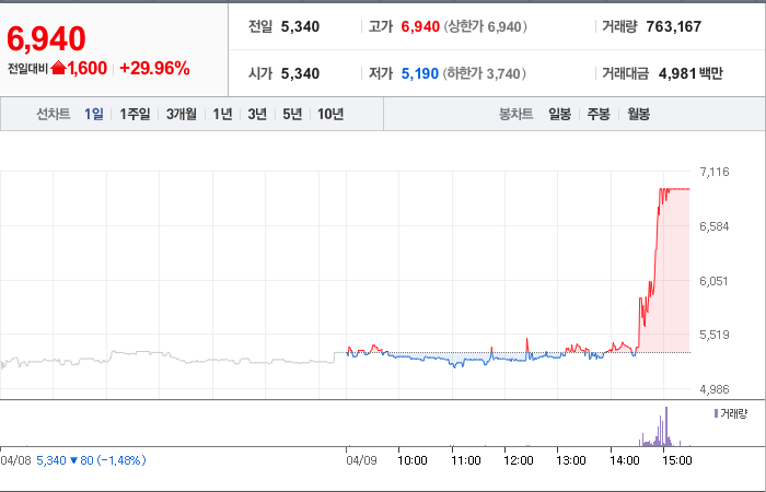 현재가: 6,940, 어제대비:+1,600시총: 262억원, 거래량:763,167, 거래대금:4,981백만