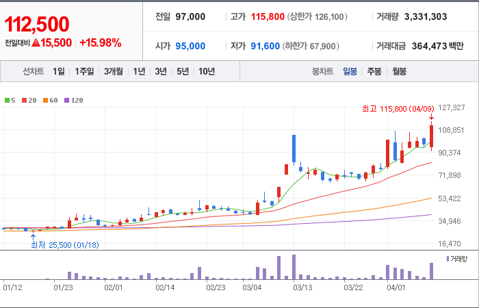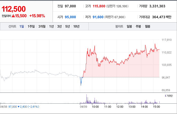 현재가: 112,500, 어제대비:+15,500시총: 6,972억원, 거래량:3,331,303, 거래대금:364,473백만