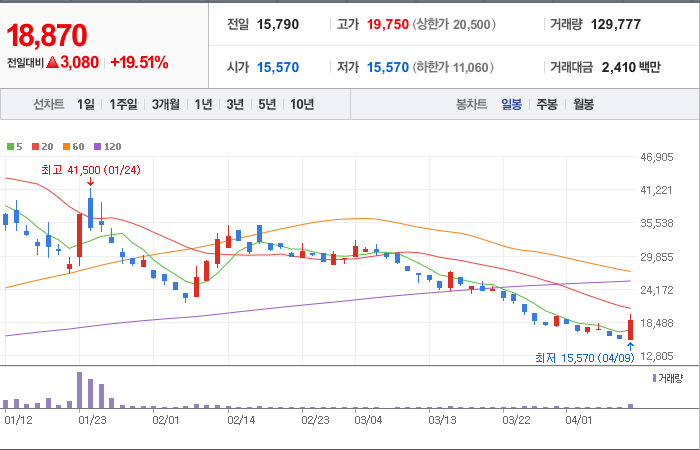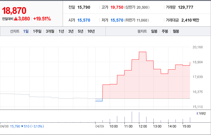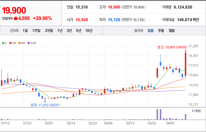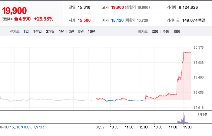 현재가: 19,900, 어제대비:+4,590시총: 1조 3,973억원, 거래량:8,124,826, 거래대금:149,074백만