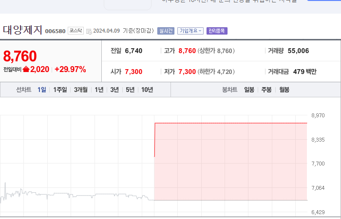 대양제지, 자진 상장폐지 결정에 상한가[핫스탁](종합) 뉴시스 2024.04.09 15:39