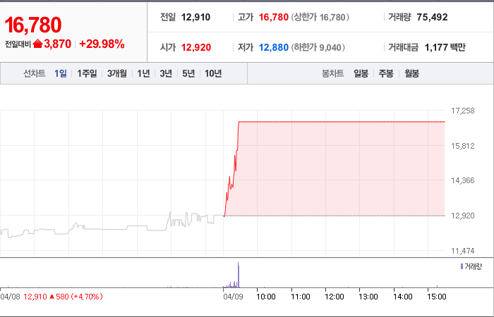 현재가: 16,780, 어제대비:+3,870시총: 201억원, 거래량:75,492, 거래대금:1,177백만