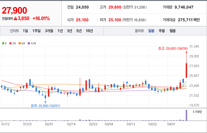 현재가: 27,900, 어제대비:+3,850시총: 6,070억원, 거래량:9,746,047, 거래대금:275,711백만