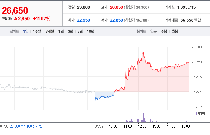 현재가: 26,650, 어제대비:+2,850시총: 2,985억원, 거래량:1,395,715, 거래대금:36,658백만