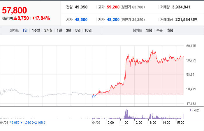 현재가: 57,800, 어제대비:+8,750시총: 1조 7,561억원, 거래량:3,934,841, 거래대금:221,564백만