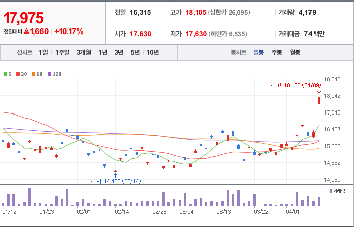 현재가: 17,975, 어제대비:+1,660시총: 180억원, 거래량:4,179, 거래대금:74백만