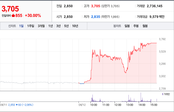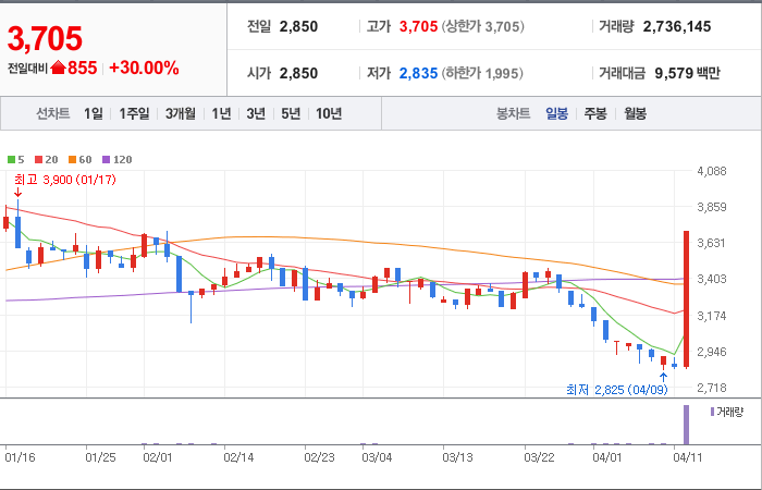 현재가: 3,705, 어제대비:+855시총: 297억원, 거래량:2,736,145, 거래대금:9,579백만