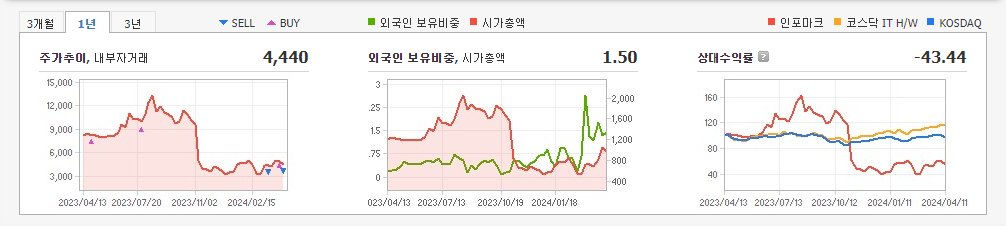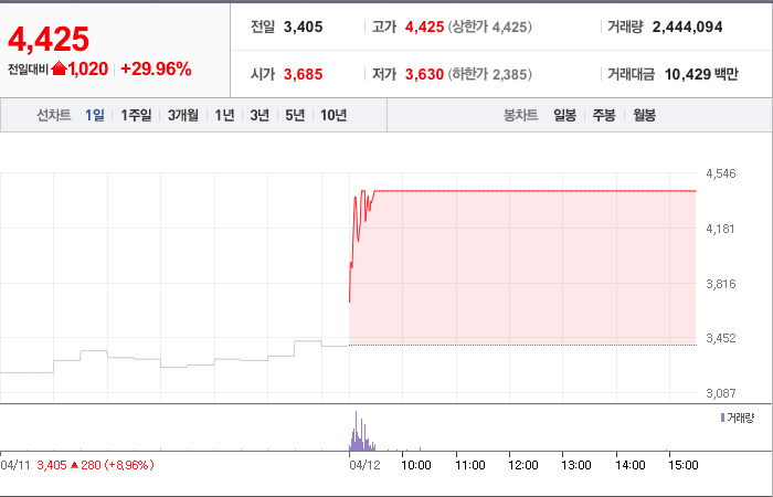 현재가: 4,425, 어제대비:+1,020시총: 116억원, 거래량:2,444,094, 거래대금:10,429백만