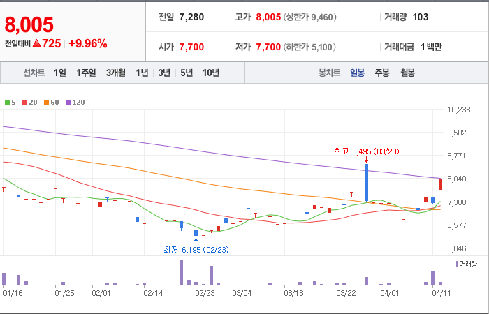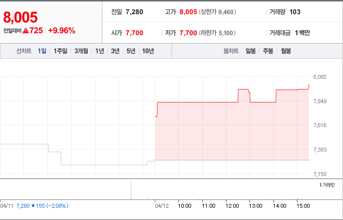 현재가: 8,005, 어제대비:+725시총: 80억원, 거래량:103, 거래대금:1백만