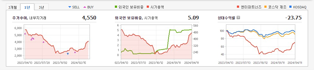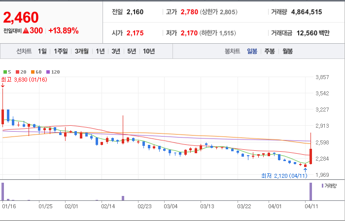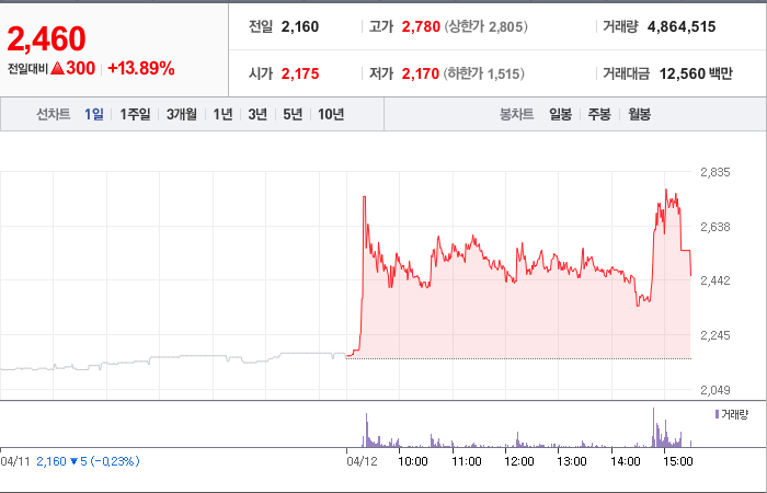 현재가: 2,460, 어제대비:+300시총: 542억원, 거래량:4,864,515, 거래대금:12,560백만