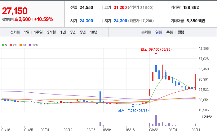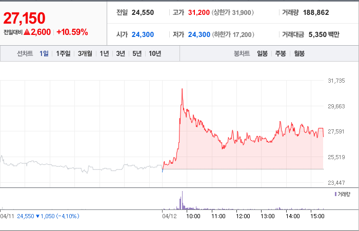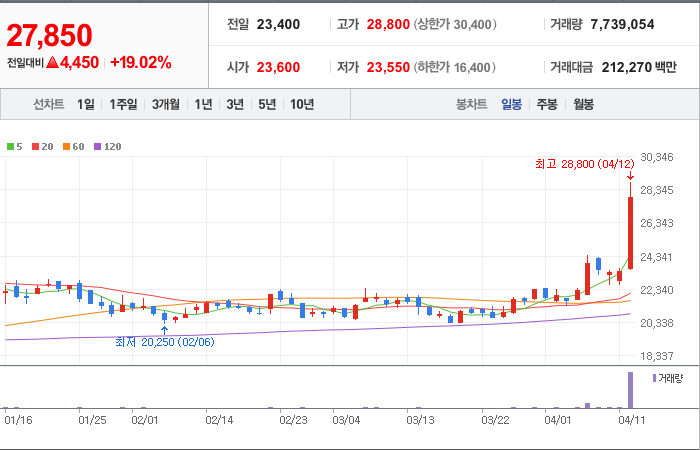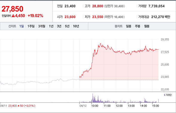 현재가: 27,850, 어제대비:+4,450시총: 4,256억원, 거래량:7,739,054, 거래대금:212,270백만
