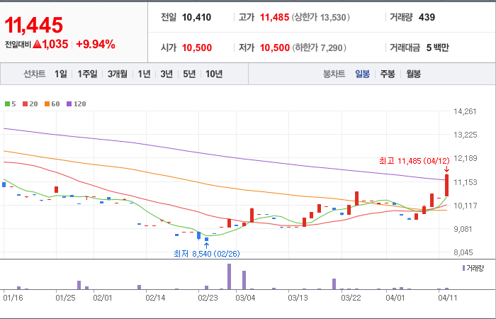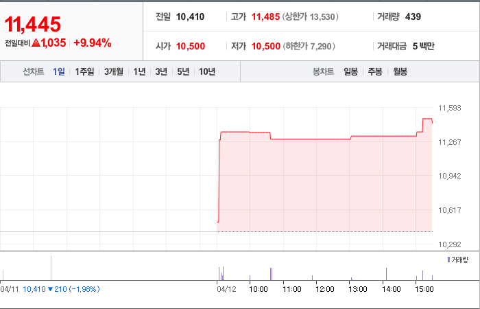 현재가: 11,445, 어제대비:+1,035시총: 114억원, 거래량:439, 거래대금:5백만