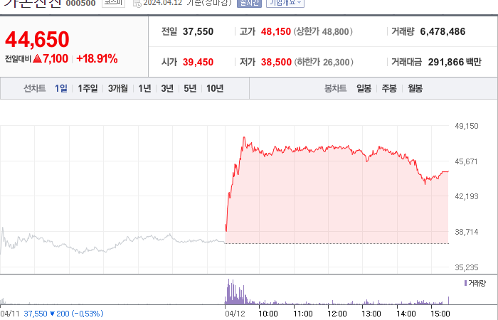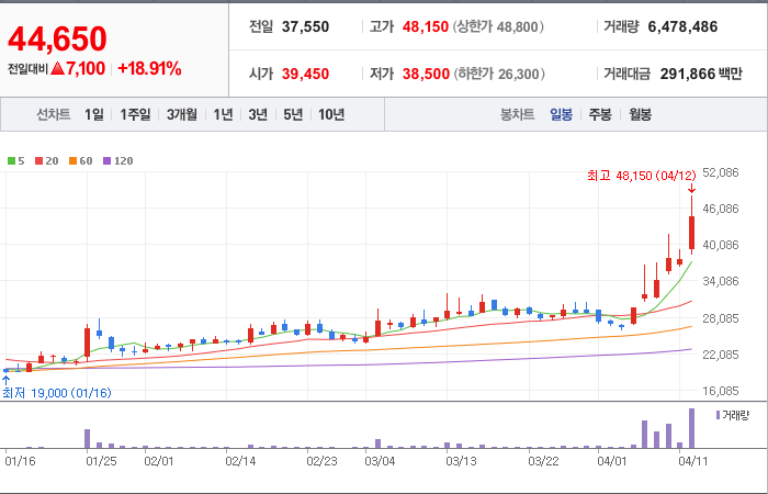 현재가: 44,650, 어제대비:+7,100시총: 3,285억원, 거래량:6,478,486, 거래대금:291,866백만