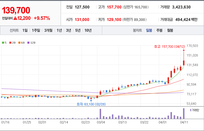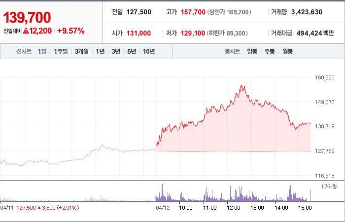 현재가: 139,700, 어제대비:+12,200시총: 4조 1,910억원, 거래량:3,423,630, 거래대금:494,424백만