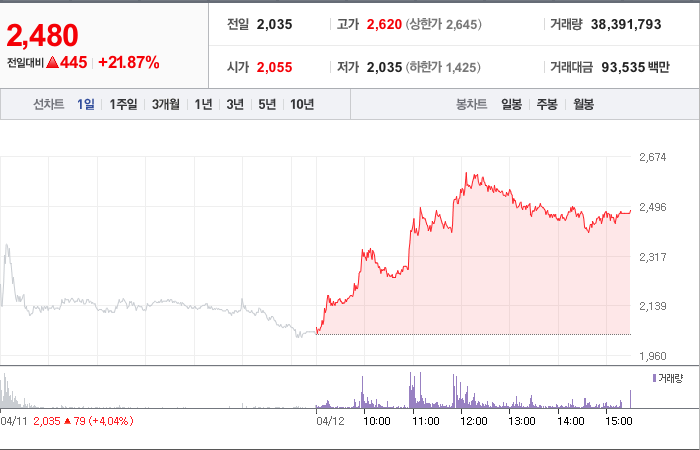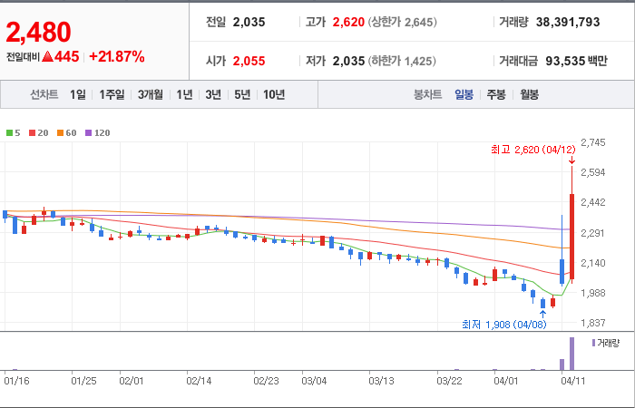 현재가: 2,480, 어제대비:+445시총: 910억원, 거래량:38,391,793, 거래대금:93,535백만