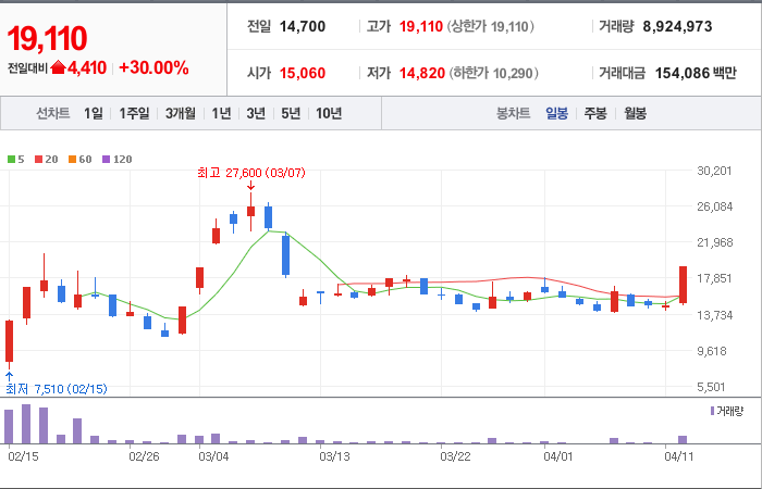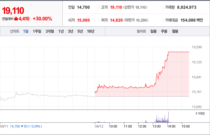 현재가: 19,110, 어제대비:+4,410시총: 4,051억원, 거래량:8,924,973, 거래대금:154,086백만