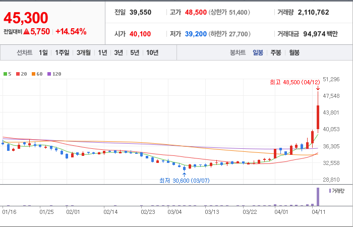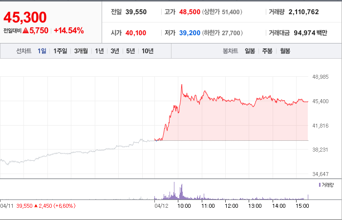 현재가: 45,300, 어제대비:+5,750시총: 4,709억원, 거래량:2,110,762, 거래대금:94,974백만