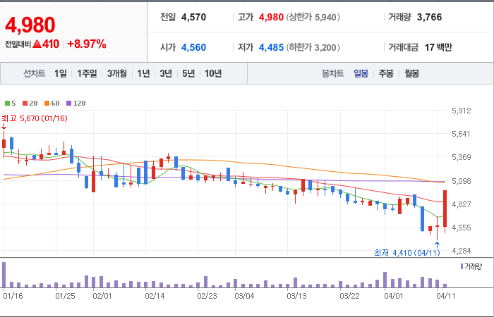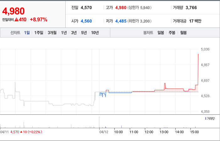 현재가: 4,980, 어제대비:+410시총: 380억원, 거래량:3,766, 거래대금:17백만