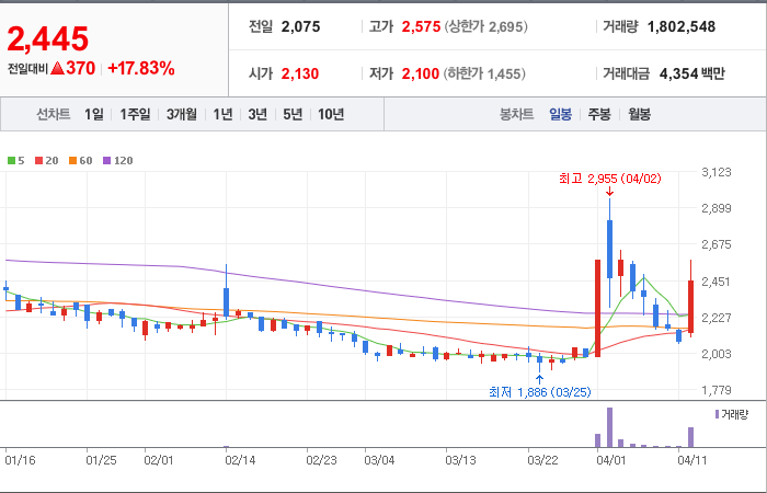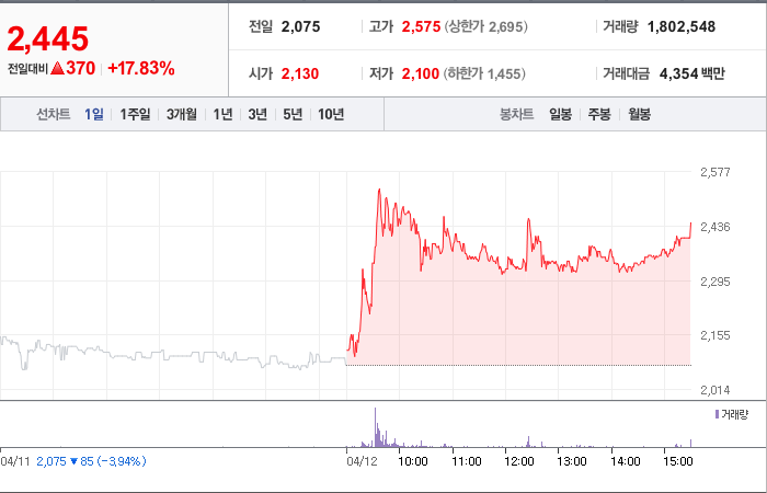 현재가: 2,445, 어제대비:+370시총: 467억원, 거래량:1,802,548, 거래대금:4,354백만