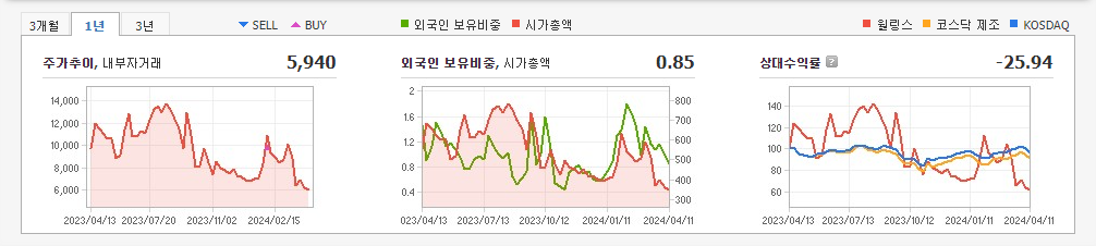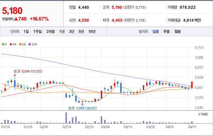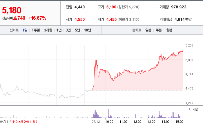 현재가: 5,180, 어제대비:+740시총: 1,114억원, 거래량:978,922, 거래대금:4,814백만