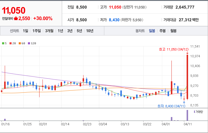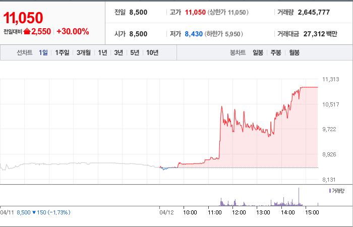현재가: 11,050, 어제대비:+2,550시총: 1,126억원, 거래량:2,645,777, 거래대금:27,312백만