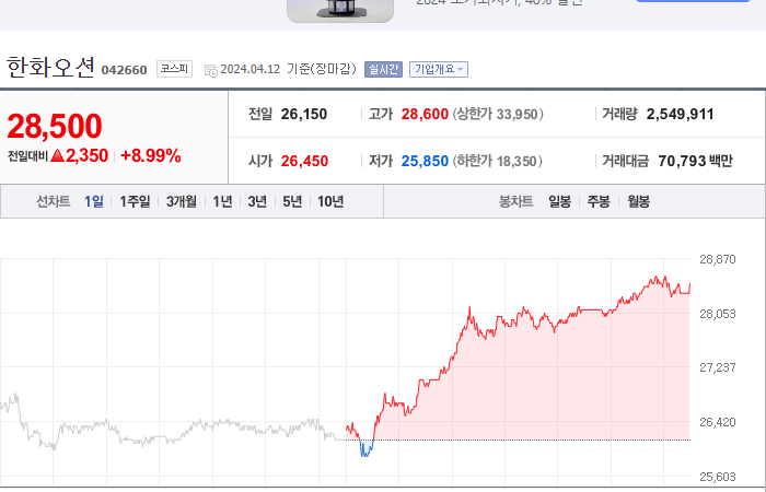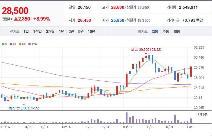 현재가: 28,500, 어제대비:+2,350시총: 8조 7,312억원, 거래량:2,549,911, 거래대금:70,793백만