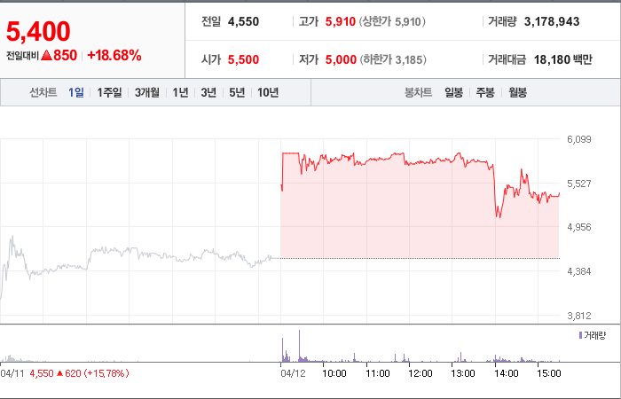 현재가: 5,400, 어제대비:+850시총: 624억원, 거래량:3,178,943, 거래대금:18,180백만