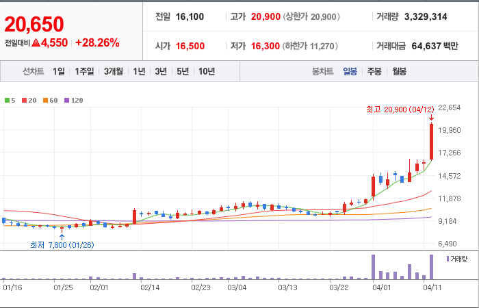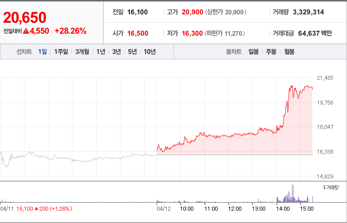 현재가: 20,650, 어제대비:+4,550시총: 2,354억원, 거래량:3,329,314, 거래대금:64,637백만