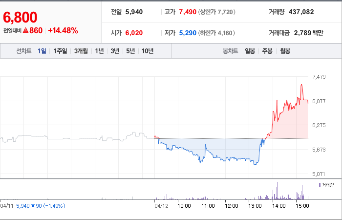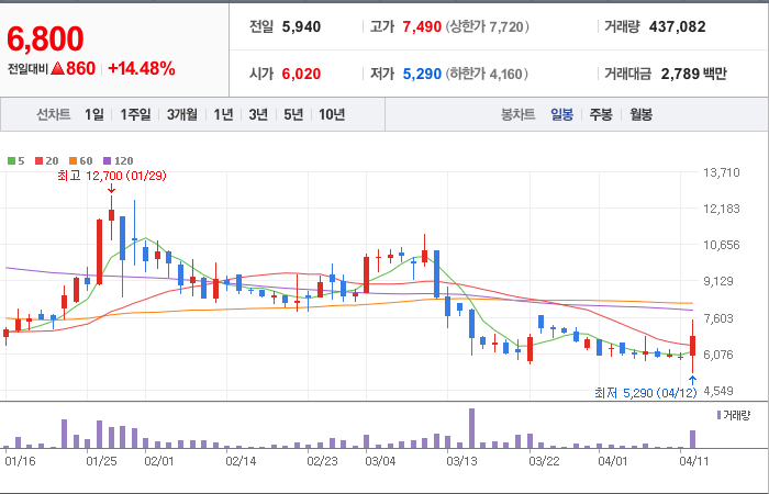 현재가: 6,800, 어제대비:+860시총: 394억원, 거래량:437,082, 거래대금:2,789백만