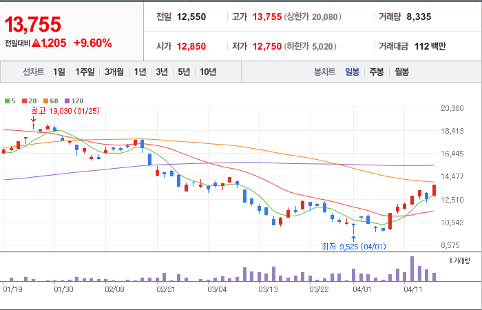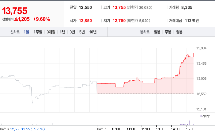 현재가: 13,755, 어제대비:+1,205시총: 138억원, 거래량:8,335, 거래대금:112백만