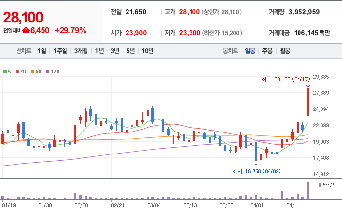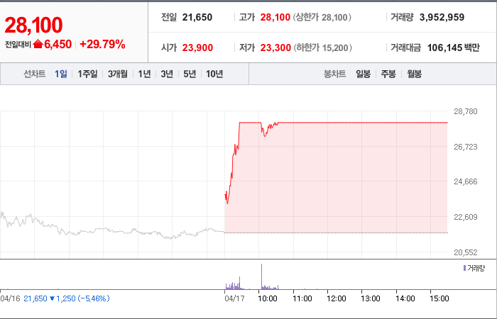 현재가: 28,100, 어제대비:+6,450시총: 5,311억원, 거래량:3,952,959, 거래대금:106,145백만