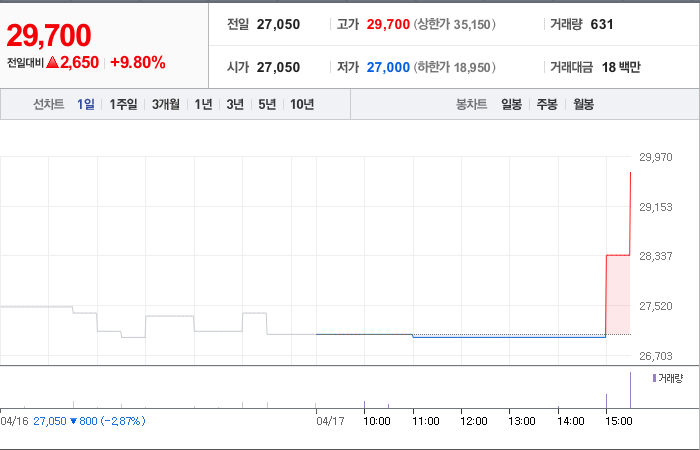 현재가: 29,700, 어제대비:+2,650시총: 72억원, 거래량:631, 거래대금:18백만