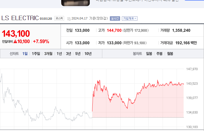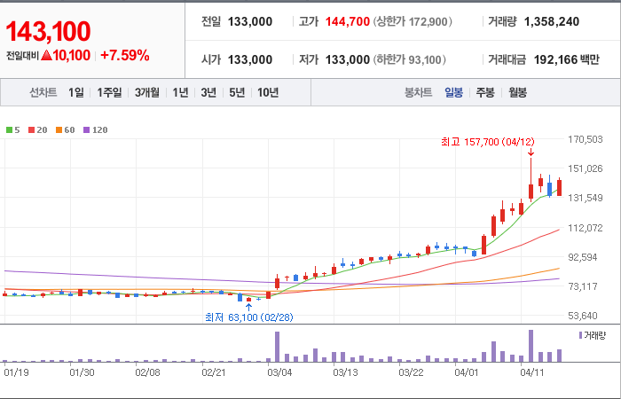 현재가: 143,100, 어제대비:+10,100시총: 4조 2,930억원, 거래량:1,358,240, 거래대금:192,166백만