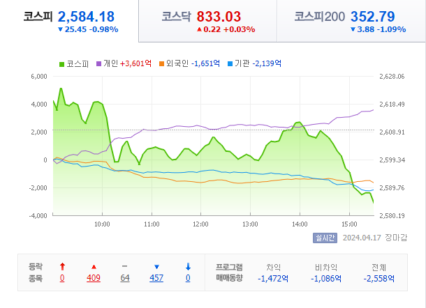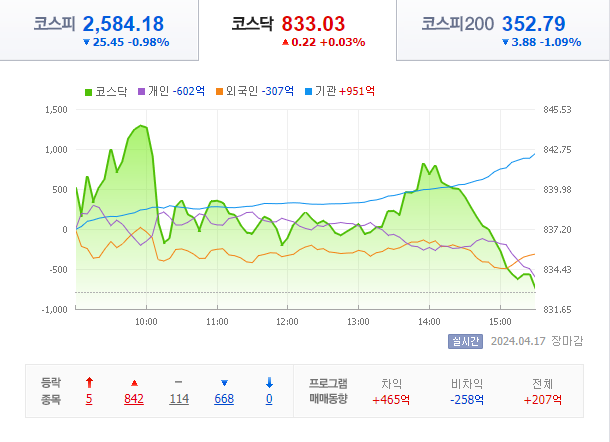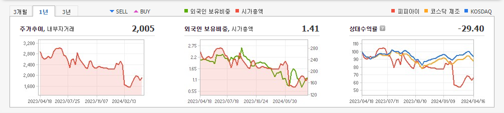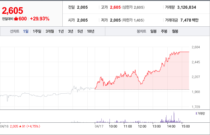 현재가: 2,605, 어제대비:+600시총: 242억원, 거래량:3,126,834, 거래대금:7,478백만