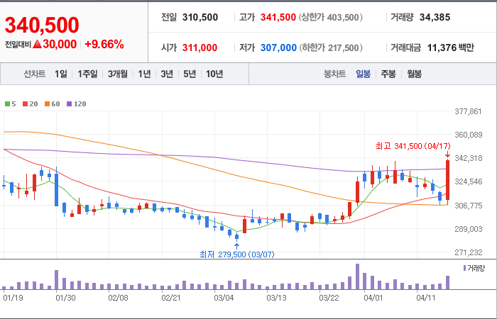 현재가: 340,500, 어제대비:+30,000시총: 1조 4,736억원, 거래량:34,385, 거래대금:11,376백만
