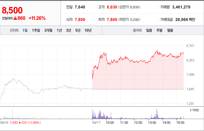 현재가: 8,500, 어제대비:+860시총: 5,150억원, 거래량:3,461,279, 거래대금:28,966백만