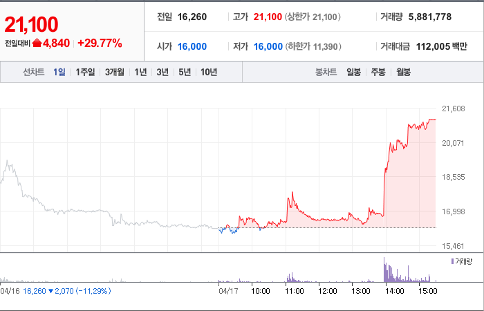 현재가: 21,100, 어제대비:+4,840시총: 2,952억원, 거래량:5,881,778, 거래대금:112,005백만