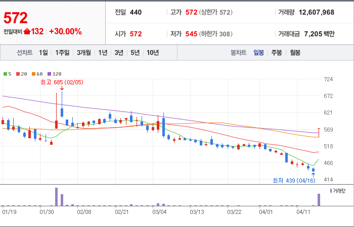 현재가: 572, 어제대비:+132시총: 920억원, 거래량:12,607,968, 거래대금:7,205백만