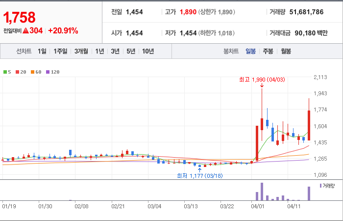 현재가: 1,758, 어제대비:+304시총: 966억원, 거래량:51,681,786, 거래대금:90,180백만