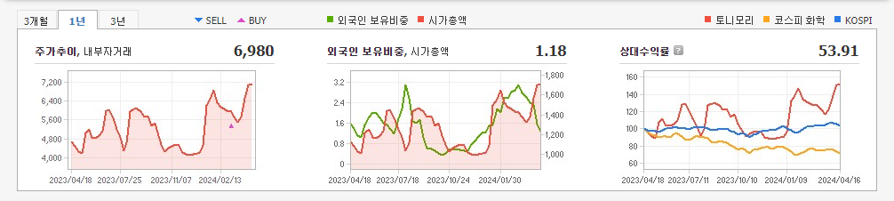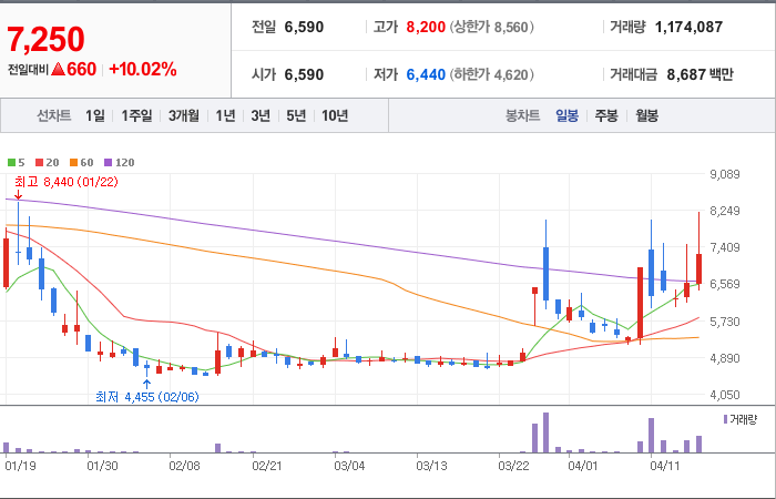 현재가: 7,250, 어제대비:+660시총: 274억원, 거래량:1,174,087, 거래대금:8,687백만