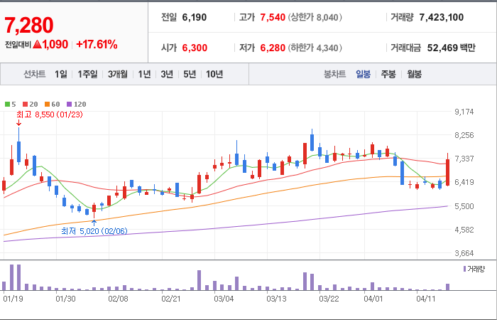 현재가: 7,280, 어제대비:+1,090시총: 5,973억원, 거래량:7,423,100, 거래대금:52,469백만