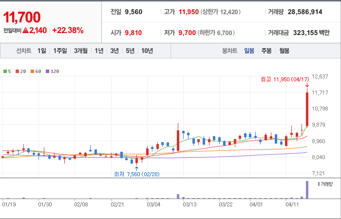 현재가: 11,700, 어제대비:+2,140시총: 3,588억원, 거래량:28,586,914, 거래대금:323,155백만
