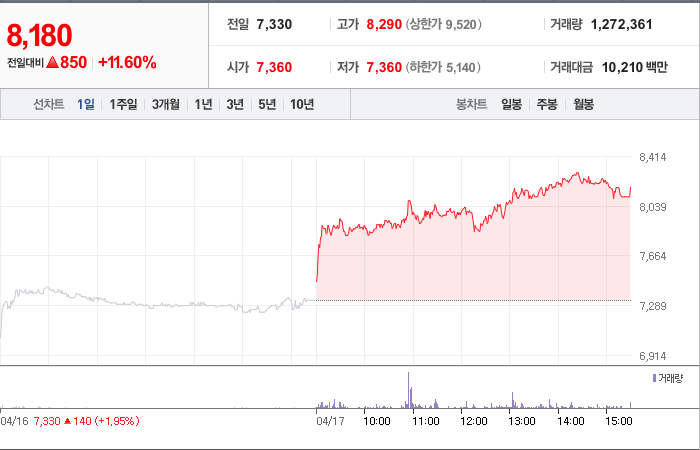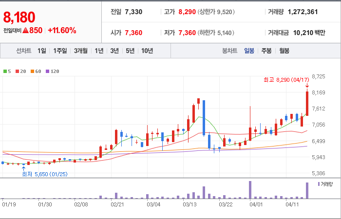 현재가: 8,180, 어제대비:+850시총: 3,544억원, 거래량:1,272,361, 거래대금:10,210백만