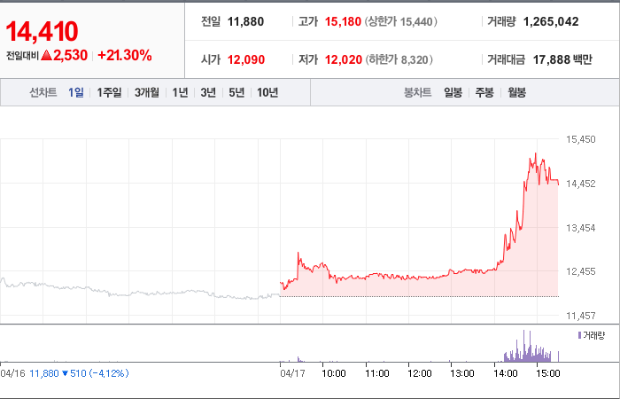현재가: 14,410, 어제대비:+2,530시총: 803억원, 거래량:1,265,042, 거래대금:17,888백만