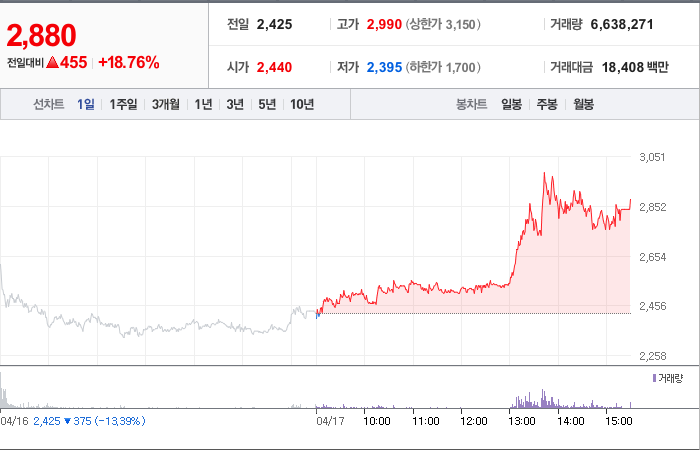 현재가: 2,880, 어제대비:+455시총: 824억원, 거래량:6,638,271, 거래대금:18,408백만